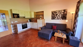 Die 4 Sterne (DTV) Wohnung befindet sich im Erdgeschoss, ist ca. 65 m² groß und ist im Landhausstil komfortabel eingerichtet, sowie durch einen eigenen Eingang zu erreichen. Sie verfügt über zwei Schlafzimmer, Dusche/ WC, einen Balkon, eine gemütliche Wohnküche mit Spülmaschine, E-Herd mit Ceranfeld, Toaster, Wasserkocher, Kaffeemaschine, Mixer, Mikrowelle, TV und Radio